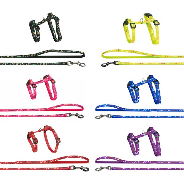 Conjunto de arnés y correa para gato. Hecho de nylon resistente, decorado con patrones divertidos, es ajustable 25-35cm, dispone de 2 cierres de seguridad de clic. La correa mide 1 metro.