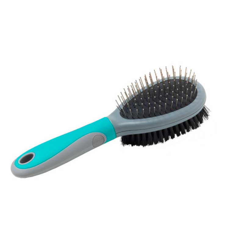 Cepillo 2 en 1 para perros y gatos. La parte de las cardas con los pasadores de acero inoxidable se encarga de desenredar y eliminar el pelo muerto y la parte del cepillo deja el cabello liso y perfecto. Ideal para un cepillado en profundidad con un pulido final. Apto para perros y gatos de pelo medio y largo.