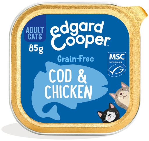 La deliciosa comida húmeda de Edgard Cooper para gato contiene mucha carne fresca, elaborada con ingredientes naturales. No contiene cereales. Contiene alto porcentaje en pollo y bacalao frescos. Es baja en calorías y está repleta de proteínas. Ingredientes cocinados lentamente para conservar todos sus nutrientes. Apta para gatos adultos.