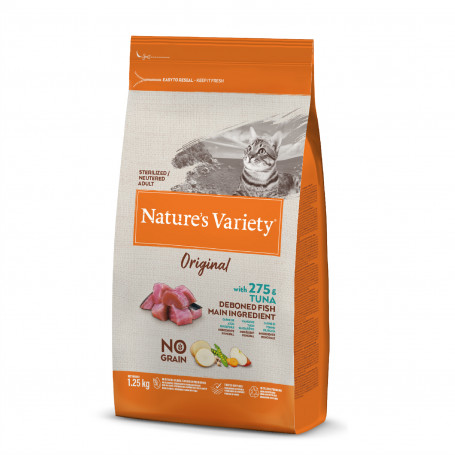 Pienso cuya receta es hecha a base de atún para gatos adultos esterilizados. Composición adaptada a sus necesidades después de la castración/esterilización. Sus ingredientes son naturales, no contiene cereales. No contiene conservantes, ni colorantes, ni aromatizantes artificiales. Entre sus beneficios se encuentra el apoyo a la salud digestiva, ayuda a mantener un peso saludable, fortalece sus defensas, mantiene cuidado el pelo y su piel, contribuye a un estado físico óptimo.