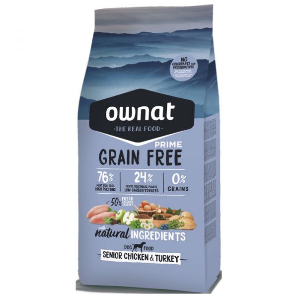 Ownat prime Senior es un pienso para perros senior mayores de 7 años, libre de cereales y con pollo y pavo frescos, el resto de la composición son frutas, verduras y legumbres. Contiene prebióticos FOS y MOS para favorecer el desarrollo de la flora intestinal. Bajo en carbohidratos.
