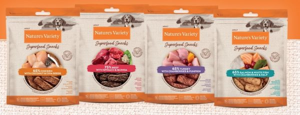 Estas delicias están cocinadas a baja temperatura por lo que conservan todas sus propiedades y mantienen su sabor intacto. ¡Tu peludo no podrá resistirse a los bocaditos Nature’s Variety Superfoods!